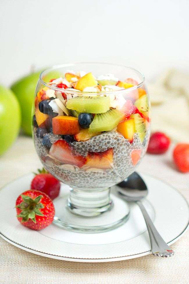 - To assemble: Add a couple of spoonfuls of chia pudding in a small glass or glass jar. Add one-third of the sliced almonds after the pudding. Spoon some fruits on top. Repeat and add another couple spoonfuls of chia pudding, followed by another one-third of sliced almonds and more fruits. Repeat a final time until the glass/jar has been filled.