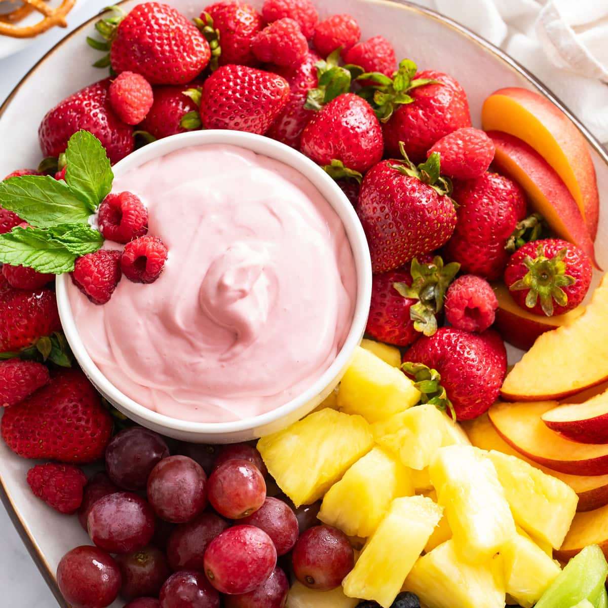- Feel free to add finely diced strawberries or raspberries to the dip as well!