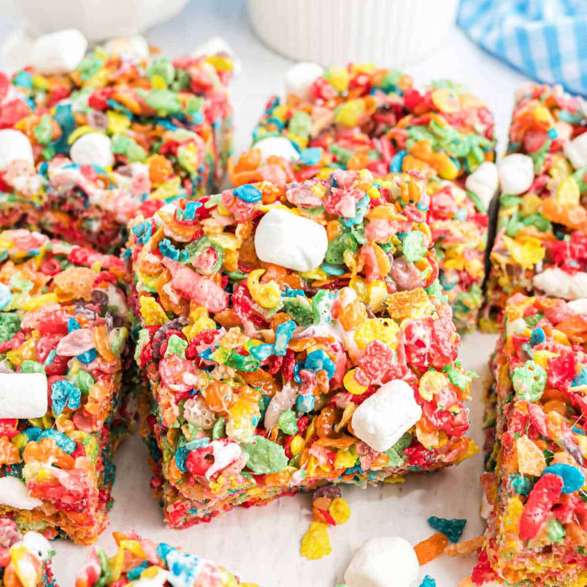 Fruity Pebbles Treats are no bake dessert bars with only 4-ingredients. Easy to make and fun to eat, these gooey treats are a hit with the whole family!