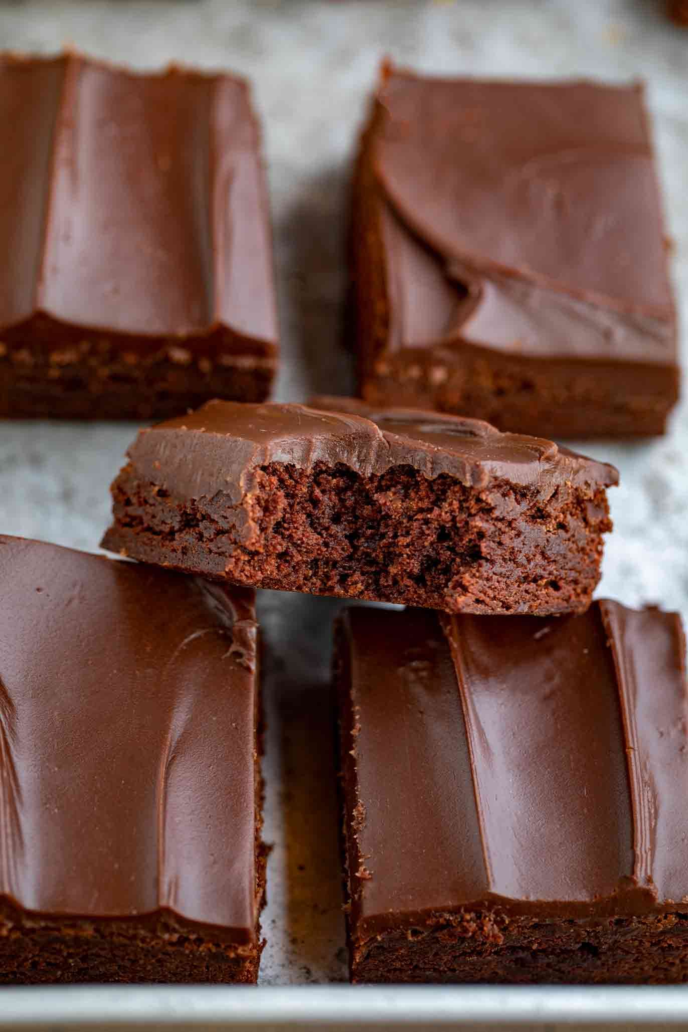 Fudge Iced Brownies are soft and chewy treats made with simple ingredients. Ready to serve in under an hour! Try them today!