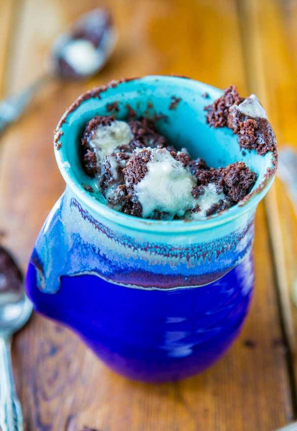 This is the best microwave mugcake I’ve ever made because it’s moist and not dry in the least. The texture is a cross between soft, moist devil’s food cake and a fudgy brownie. Both melted chocolate chips and cocoa powder give it plenty of rich chocolate flavor. The buttery vanilla glaze seeps into the porous cake, adding even more moisture and flavor. For times when you just have to have chocolate and need it in less than 5 minutes, make this. It’s dangerously fast, easy, and is sure to satisfy your chocolate cravings.