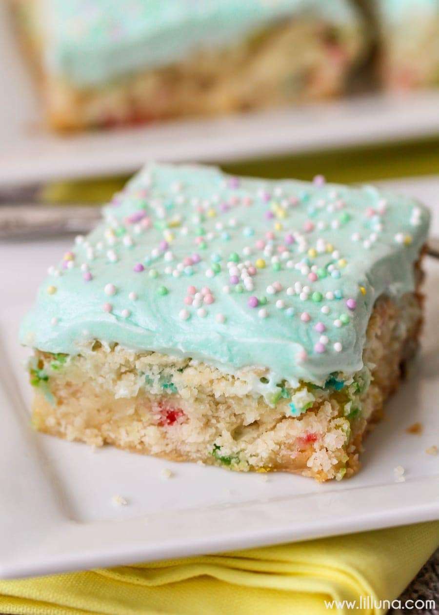 Easy Funfetti blondies are exploding with color and covered in a creamy home made frosting. They are fun, delish, and ready in a jiff!