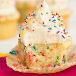 A homemade version of funfetti cupcakes - buttery vanilla cupcakes loaded with sprinkles and topped with vanilla buttercream frosting.
