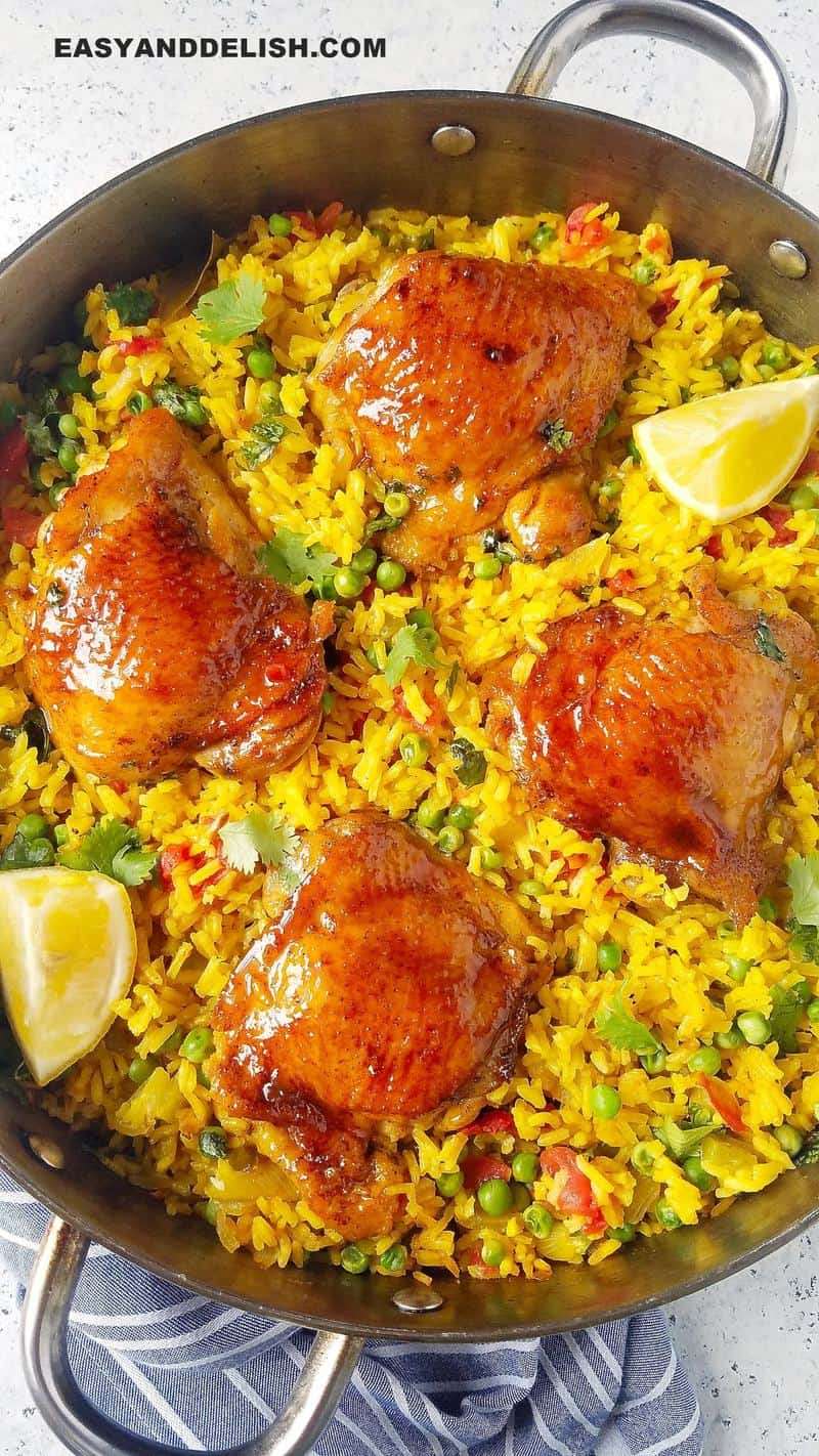 - Em seguida, cubra a panela com uma tampa e deixe cozinhar em fogo médio por 10 a 15 minutos ou até que o frango esteja cozido e o arroz ficar al dente. O arroz vai absorver os líquidos. Cerca de 3 minutos antes do final do tempo de cozimento, acrescente os tomates picados e as ervilhas, tampe e deixe cozinhar.
