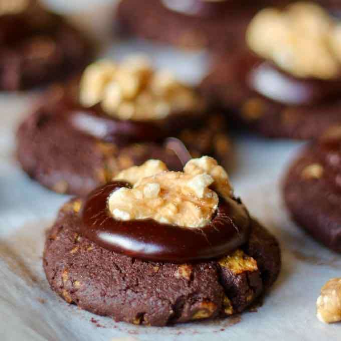- Coloque una cucharadita de glaseado en cada galleta y decore con una nuez.