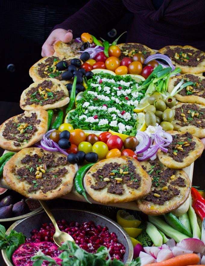 Game Day is absolute fun for us, so we always pick food that’s not just delicious, but totally fun to eat and assemble too! Make this Game Day Mini Turkish Pizza Party — It starts with flavor packed raw minced lamb with a special spice mixture on pizza dough, bake that at a high temp oven for a few minutes and once it cooks, enjoy endless toppings over it! Feta cheese, sliced onions, fresh mint, toasted pine nuts, green chilli, tomatoes, olives, peppers, pomegranate arils and finish off with a squirt of lemon juice. Fold it up and enjoy!