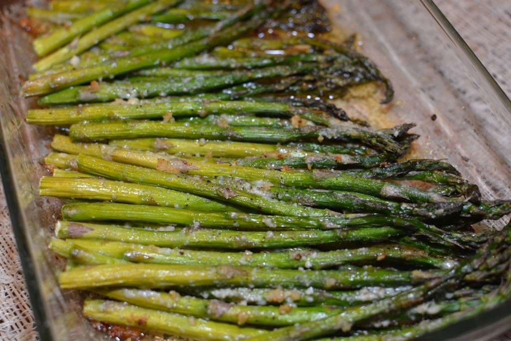 - Sprinkle garlic, Parmesan, salt, and pepper evenly on top of coated asparagus.