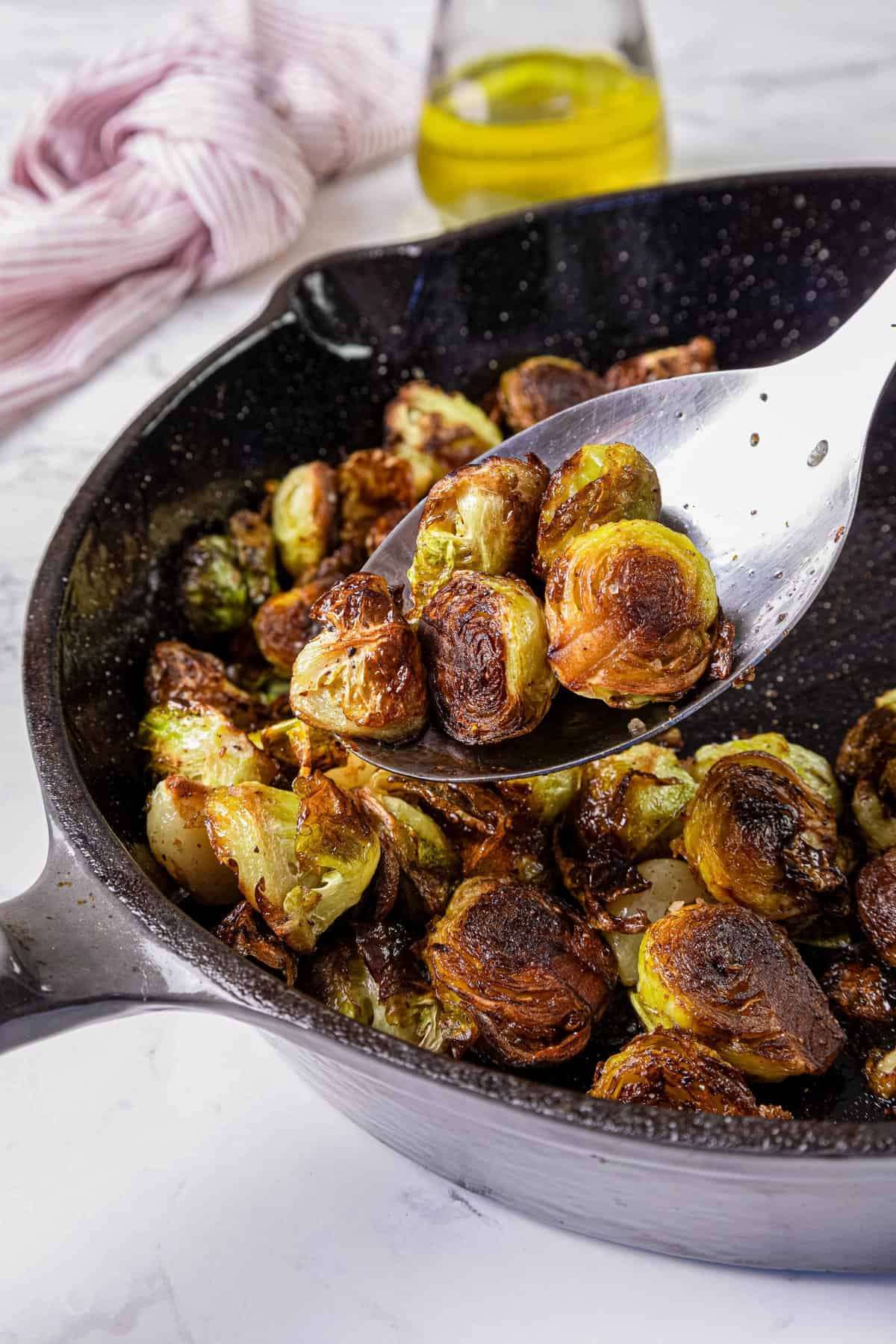 These crispy, savory Garlic Brussels Sprouts are the most delicious side for a weeknight dinner or holiday party.