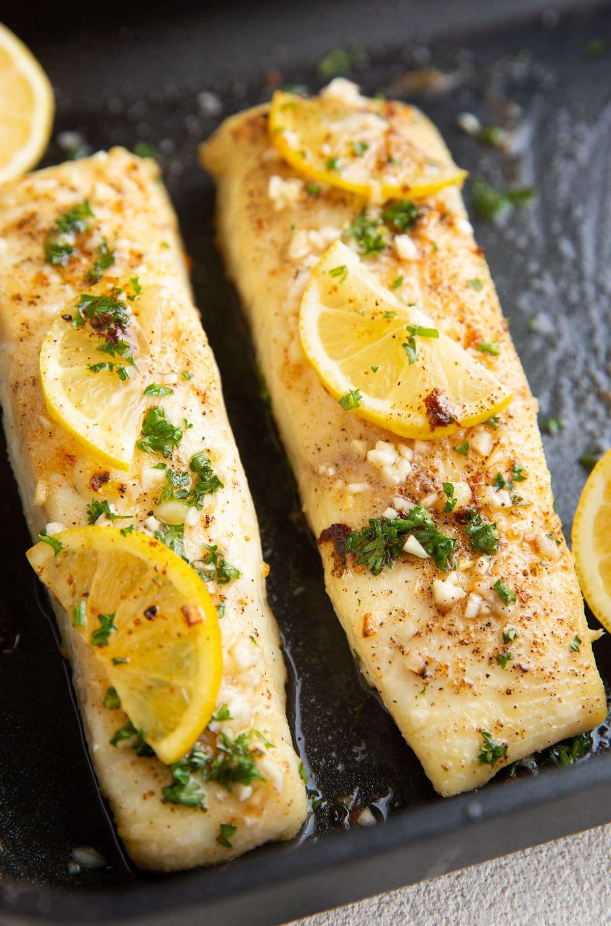 - Drizzle part of the garlic butter over the halibut filets.