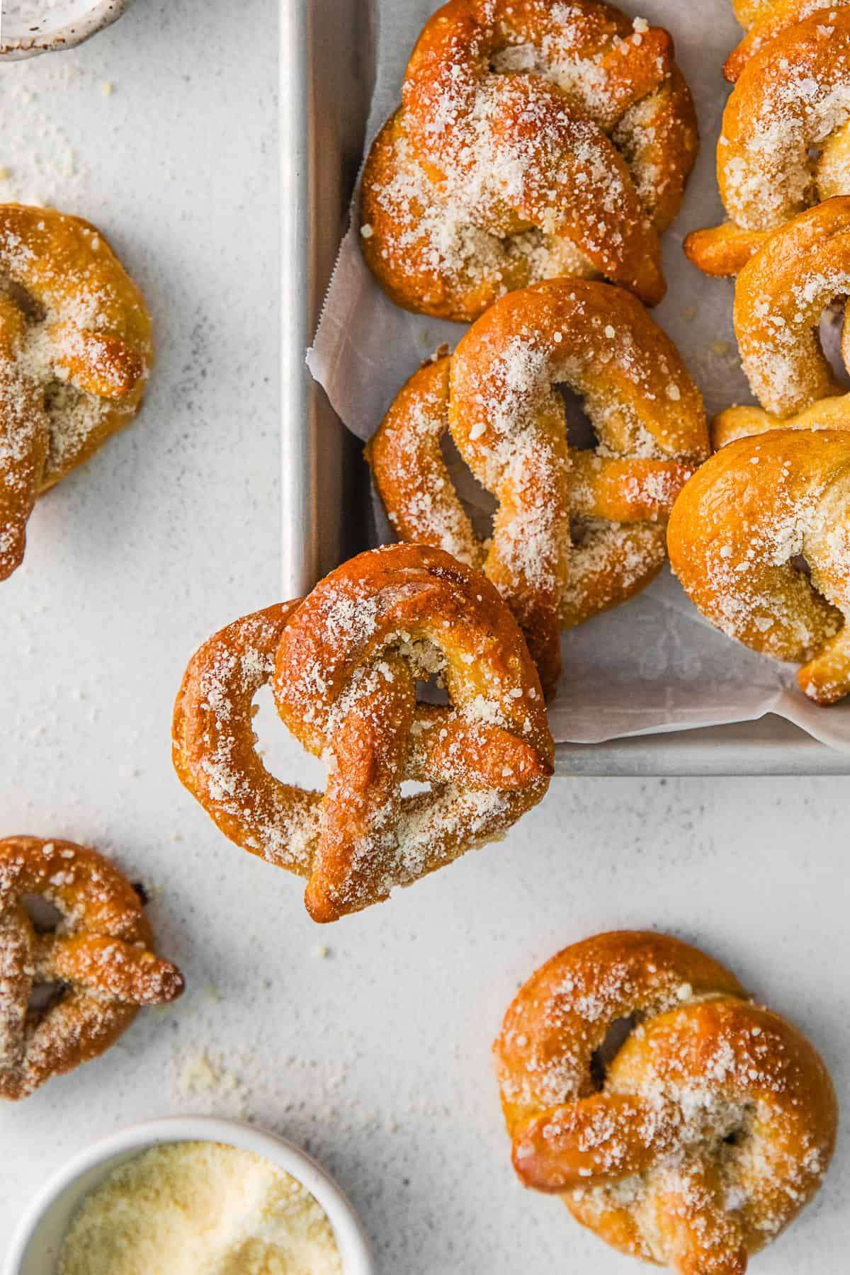 - When ready to serve, toss the pretzels with melted butter and then sprinkle over the parmesan and garlic powder.