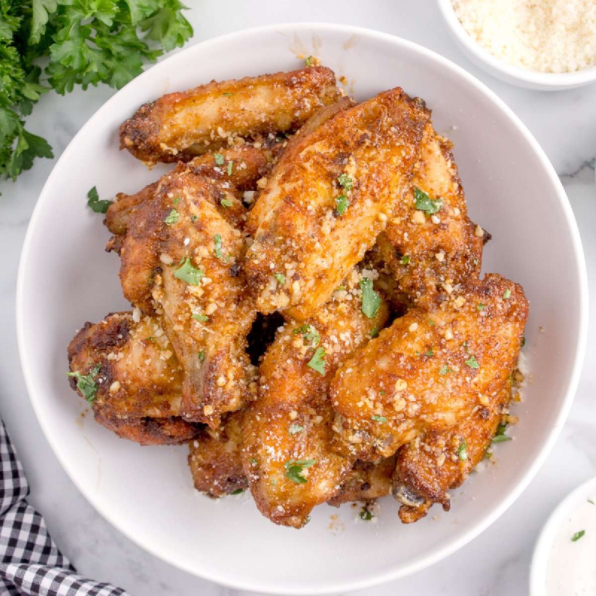 - Once cooked, transfer the wings to a large bowl. Pour the buttery garlic sauce over the cooked wings, tossing them gently to coat evenly. Sprinkle Parmesan cheese and chopped parsley over the wings and toss again to ensure an even coating.