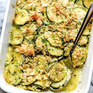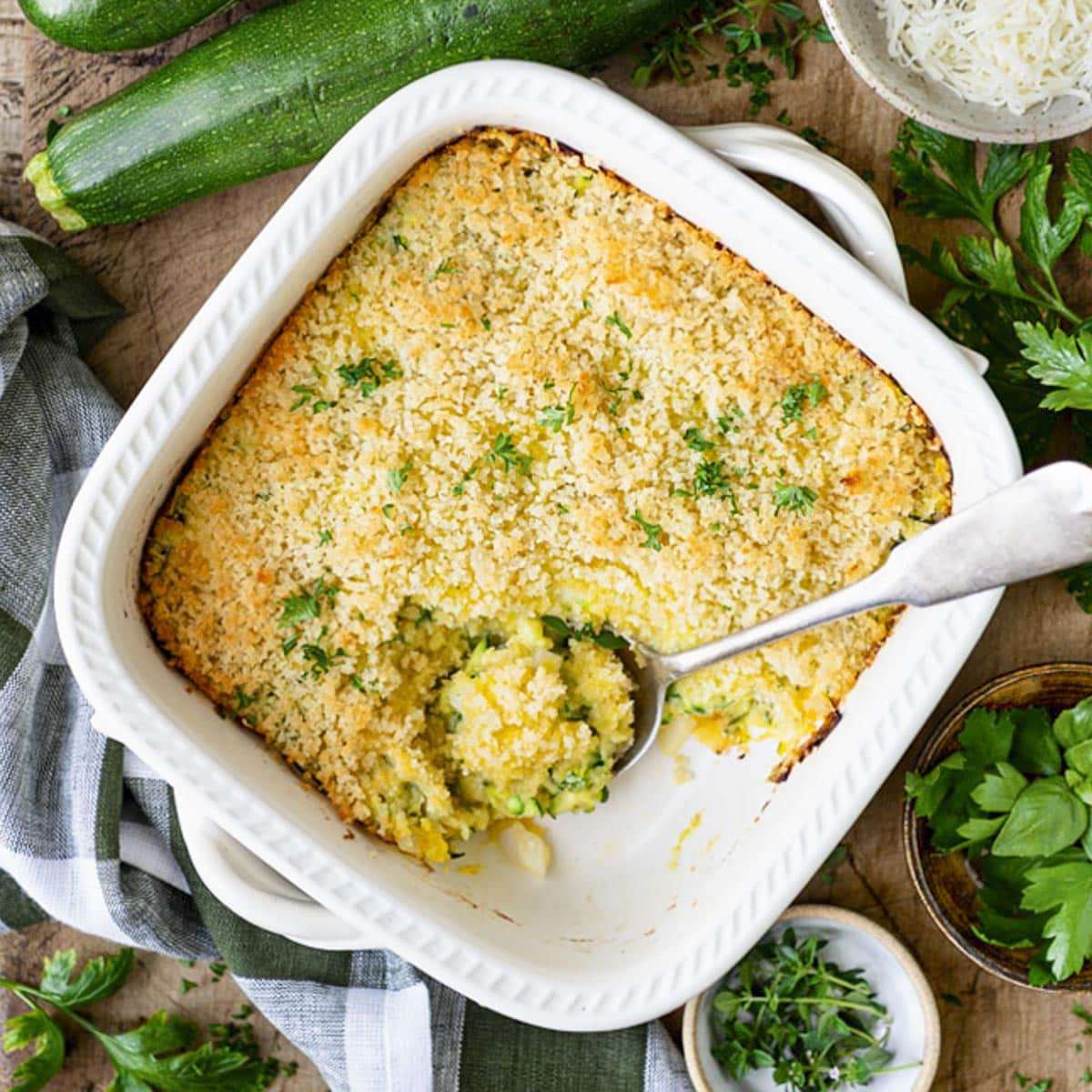 This cheesy zucchini casserole boasts a flavorful filling with a crispy, buttery breadcrumb topping.
