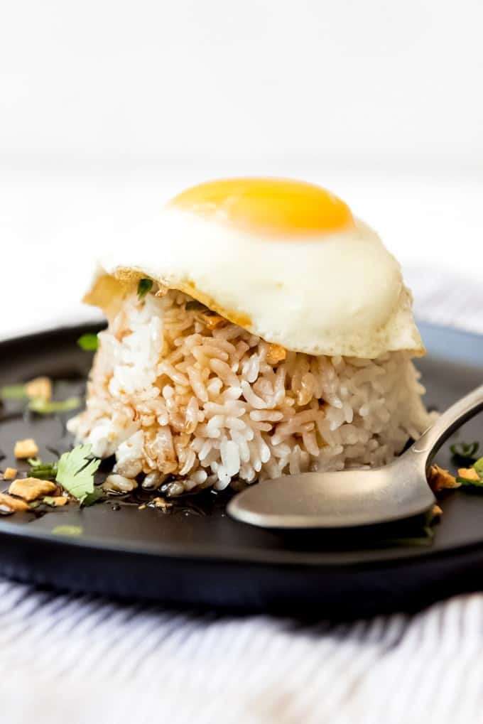Eggs aren't just for breakfast! This delicious Garlic Rice with Fried Egg is made with sticky rice, a sweet soy drizzle, crispy fried garlic, and a sunny-side up egg on top. Break the yolk and mix everything together for delicious spoonfuls of savory, flavorful rice that makes a wonderful and different dinner from the norm!