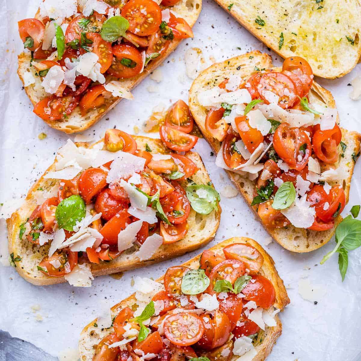 Simple tomato bruschetta recipe made with fresh tomatoes, garlic, olive oil, balsamic vinegar, basil, and parmesan cheese. Topped over toasted garlic bread. Ready in less than 20 minutes.
