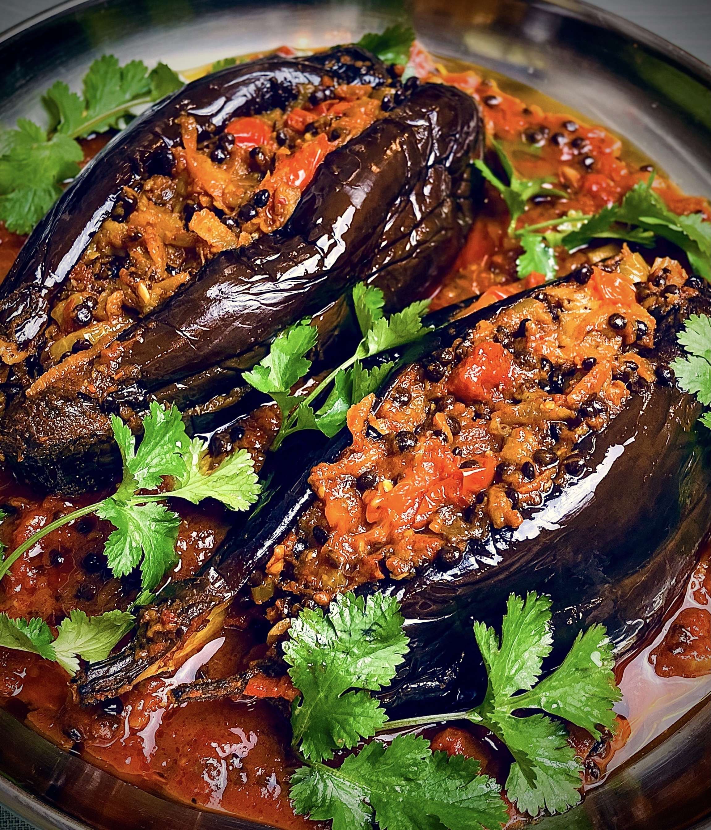 - Serve aubergine garnished with fresh coriander accompanied by rice or bread and salad with a citrus dressing. If you feel confident serve the aubergine with the split facing upwards like I have in my picture so it looks like they have been stuffed.