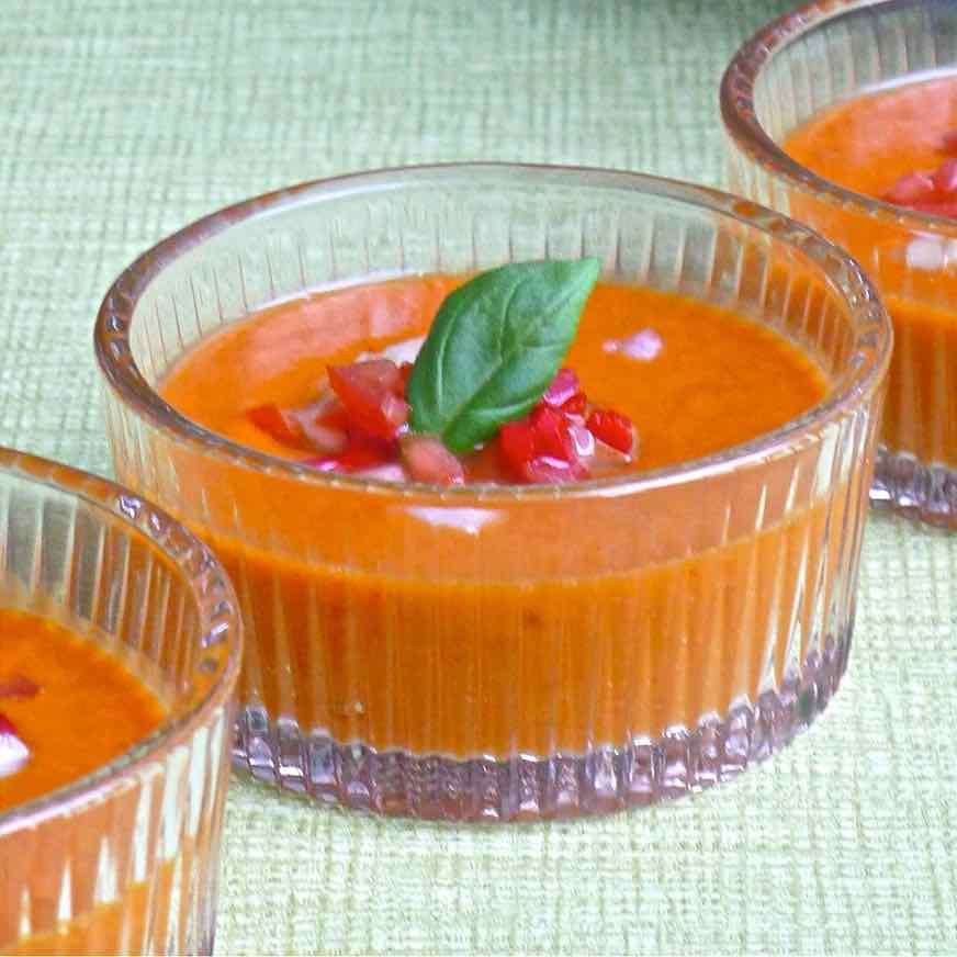 Servi très froid et traditionnellement préparée dans un mortier, le gaspacho comprend des tomates, poivrons, concombres de l'ail et du pain rassis.