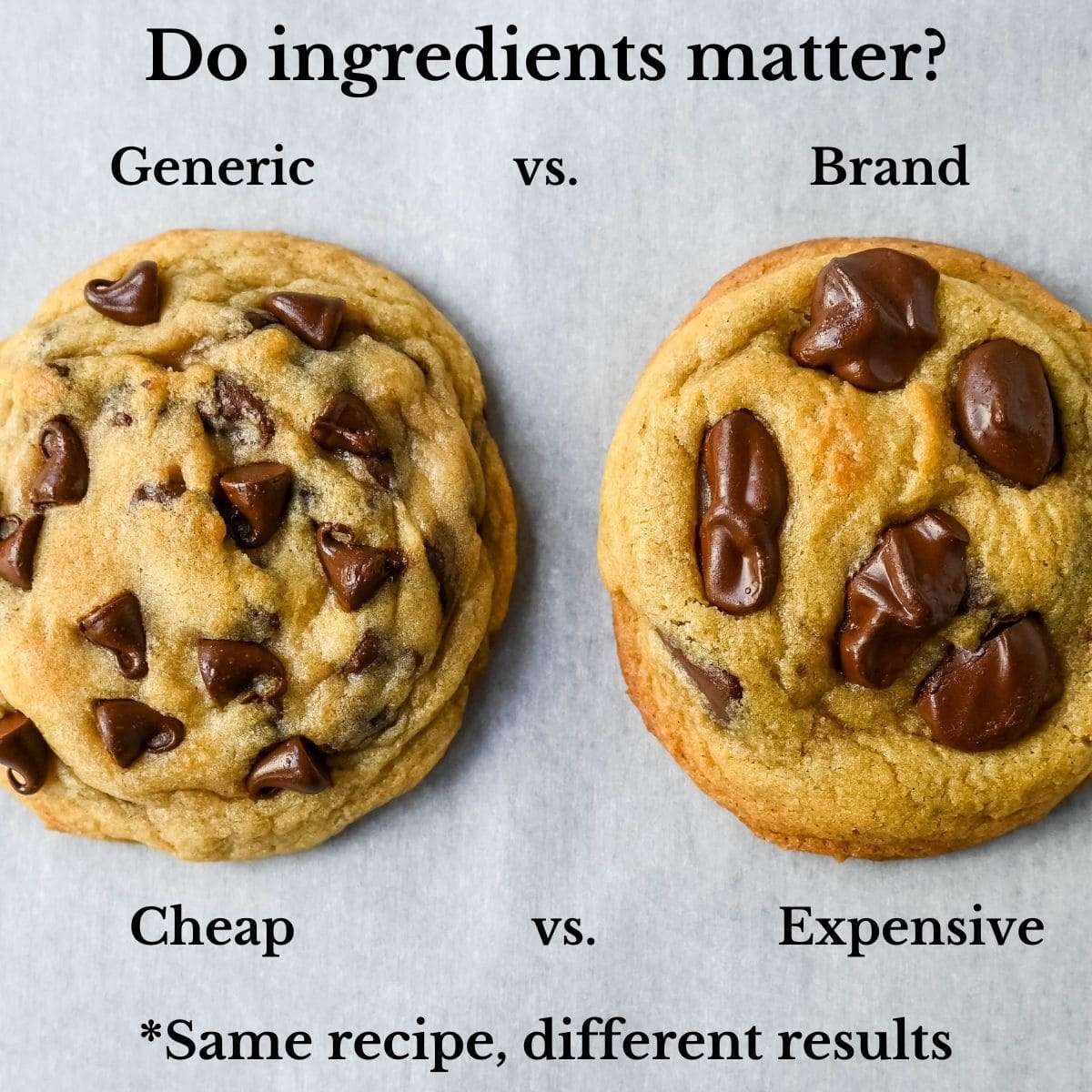 Do ingredients matter? Brand vs Generic and Expensive vs Cheap Ingredients in chocolate chip cookies. This is a comprehensive study to see if ingredients matter and make a difference in baking chocolate chip cookies. We take generic vs brand ingredients to see how it affects baking cookies. Does cheap vs expensive ingredients make a difference in cookies?