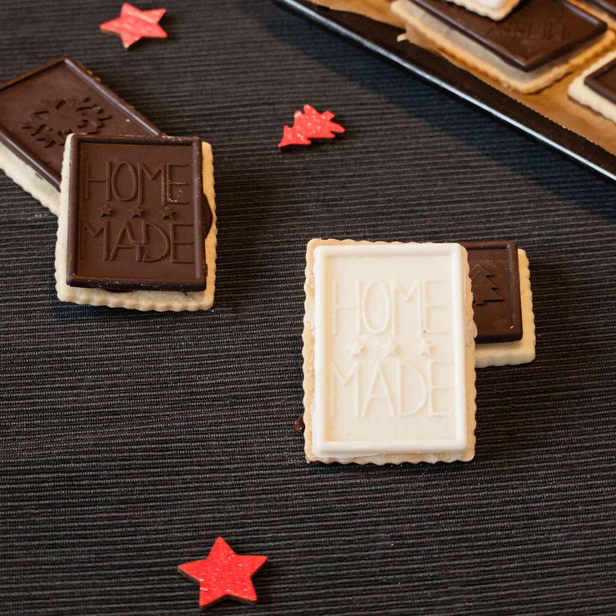 - Once your chocolate has cooled and hardened, add some melted chocolate onto the biscuit side to glue it on and stick the molded chocolate onto the shortbread cookie.