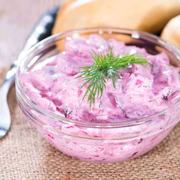 Pickled herring, apples, onions, pickles and red beets are covered in a luscious creamy sauce with a beautiful pinkish-red hue.