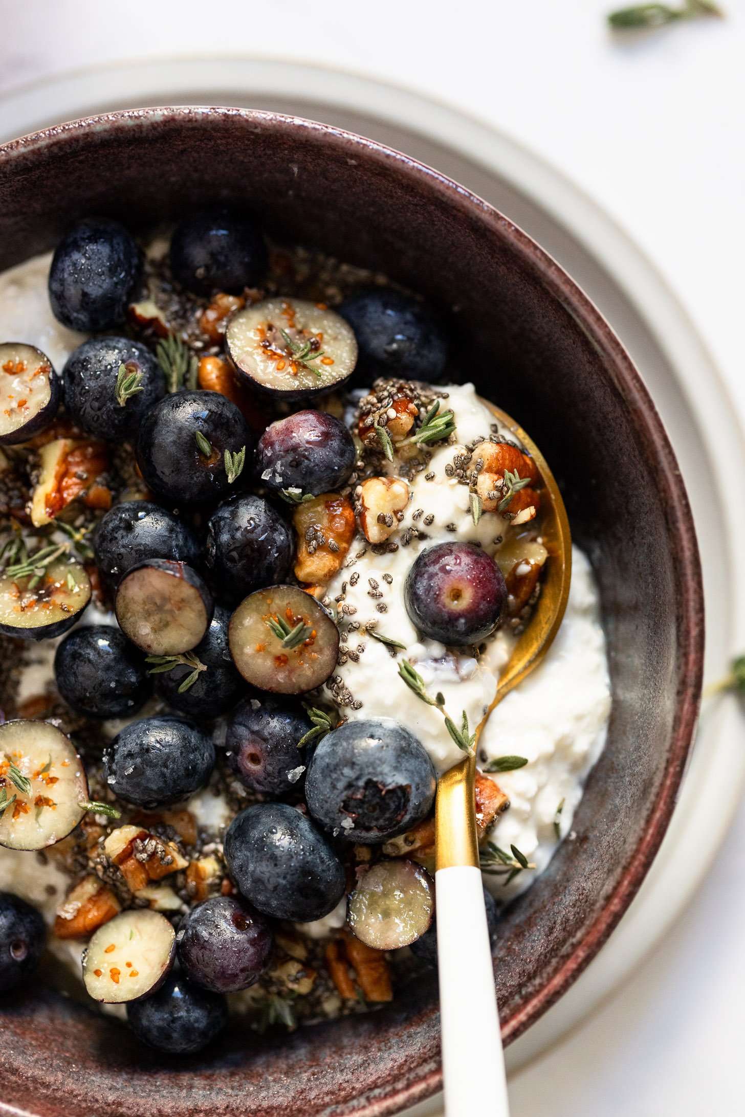 Satisfy that midday hunger craving with this easy 5-minute cottage cheese snack bowl! It's topped with blueberries and a sweet and savory blend of pecans, maple syrup, chia seeds, and fresh thyme.