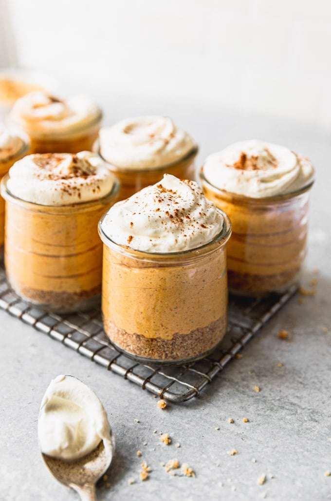 - Either pipe or gently scoop the pumpkin mousse filing into the ramekins. Top with fresh whipped cream and serve immediately or chill in the fridge until ready to serve.