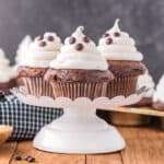 Chocolate cupcakes topped with a "ghost" make the perfect Halloween dessert. These Ghost Cupcakes have a secret hack to make that ghost on top so easy.