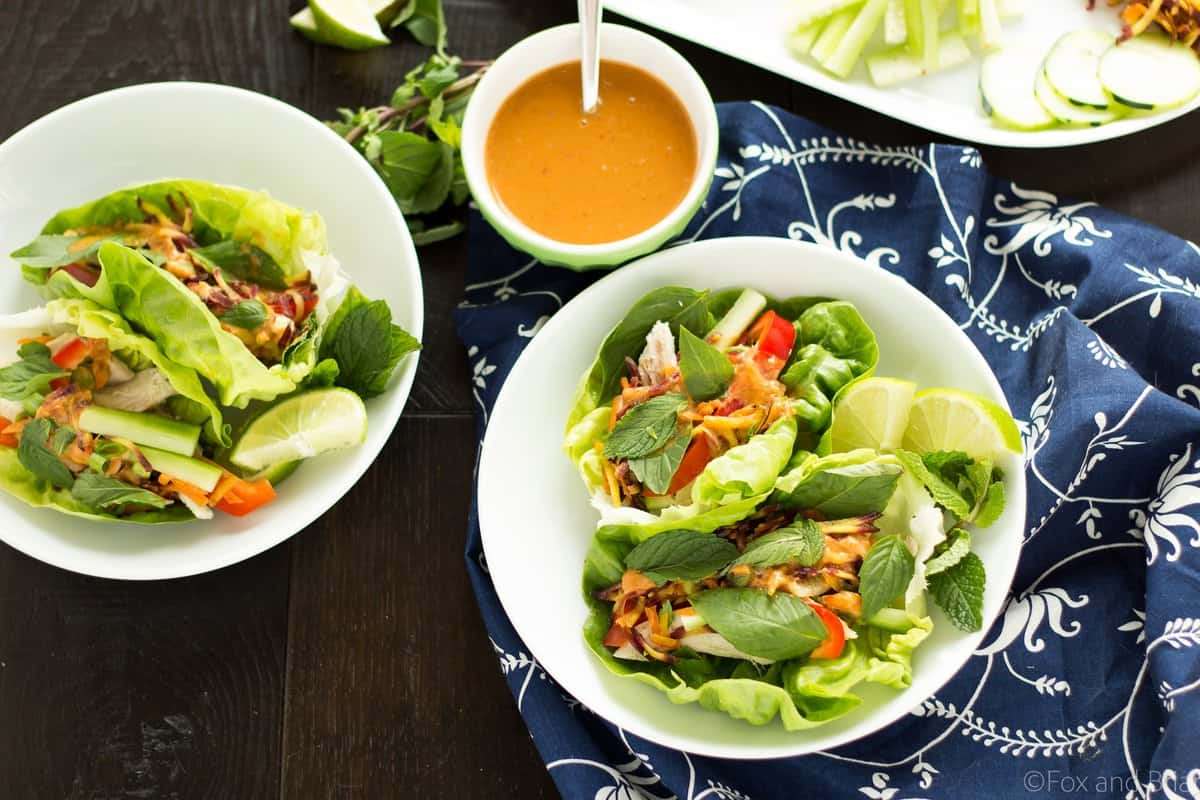 - To assemble wraps, fill with protein, veggies, a few leaves of the basil and mint, and top with peanut sauce.