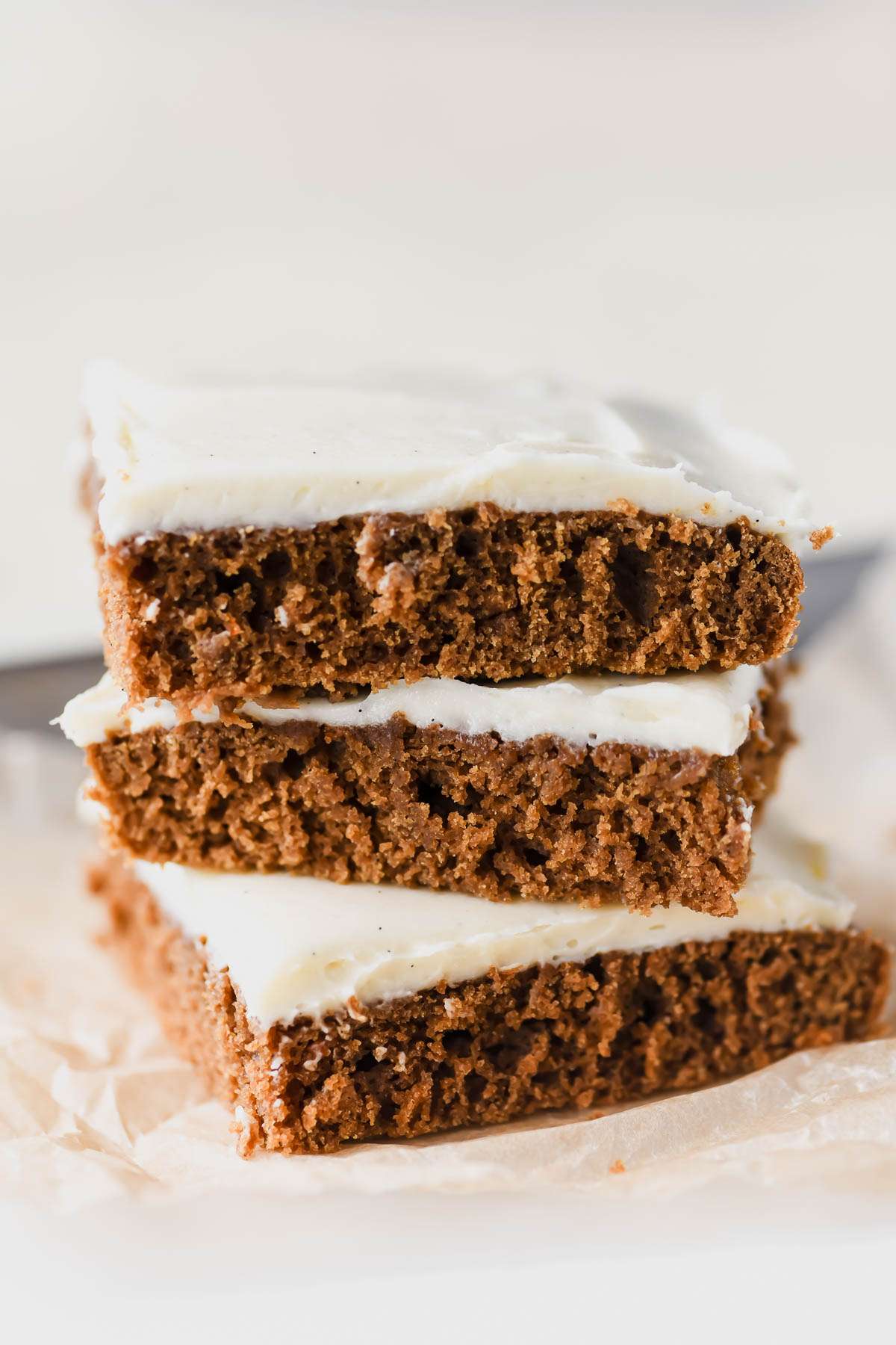 Grab some holiday spirit with easy-to-make gingerbread bars. Moist and flavorful, topped with a thick layer of vanilla cream cheese frosting.