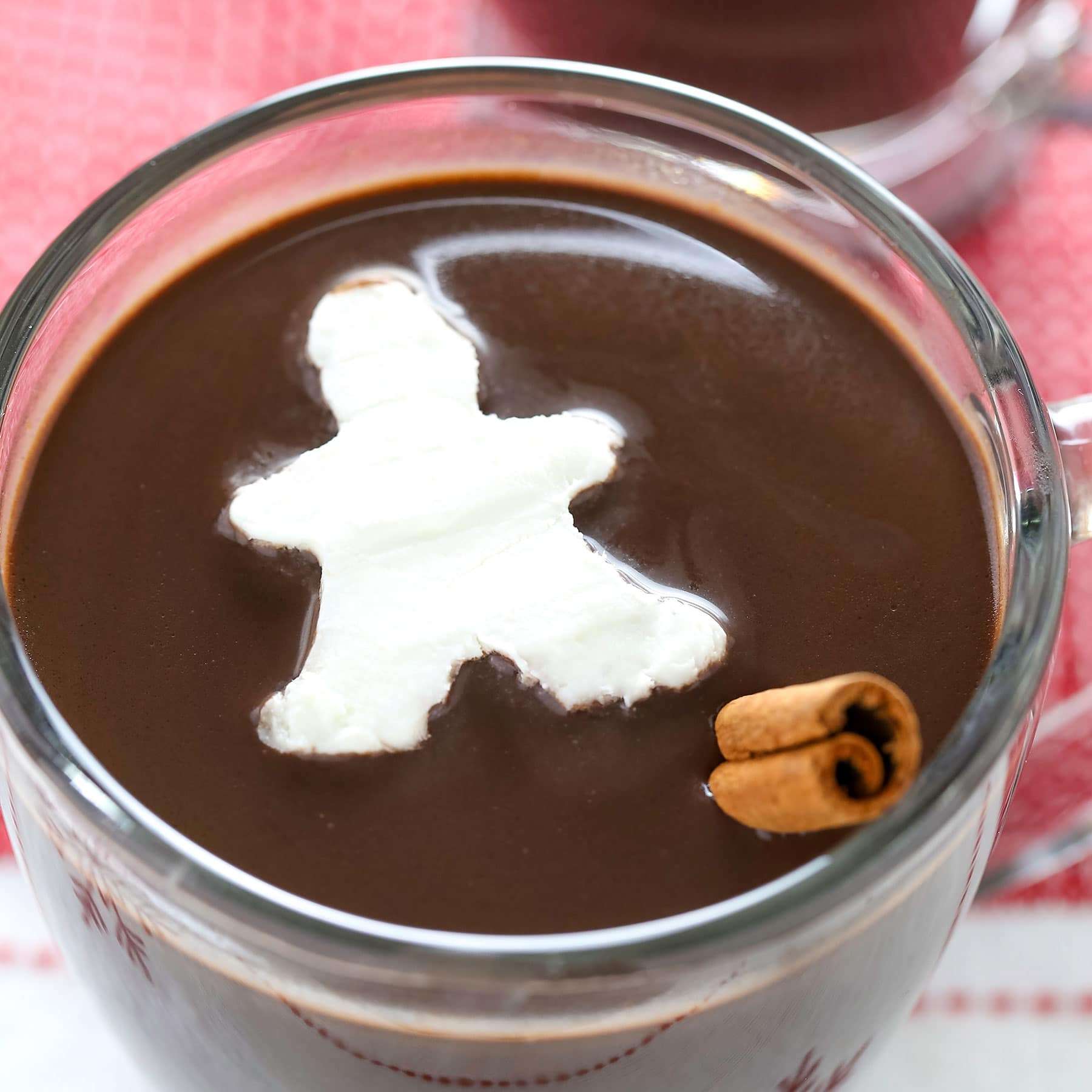 This recipe for Gingerbread Hot Chocolate complete with adorable gingerbread men whipped cream cubes is the perfect warm drink for a cold day.