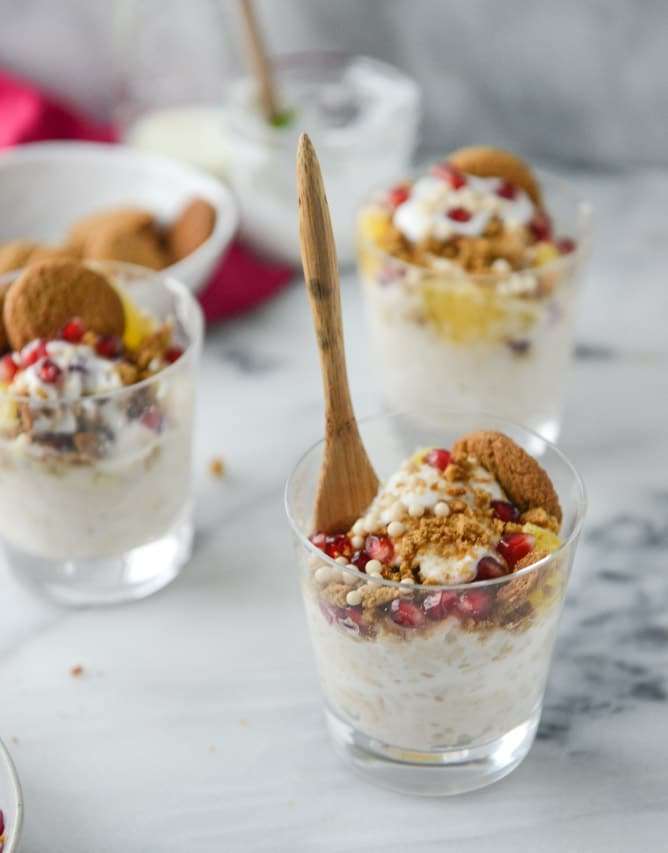 - Scoop the risotto into bowls and drizzle with a bit of milk. Cover with orange slices, pomegranate arils, extra coconut cream and more crushed cookies. I like to layer the toppings on! Finish off with a full gingersnap cookie. Serve immediately.