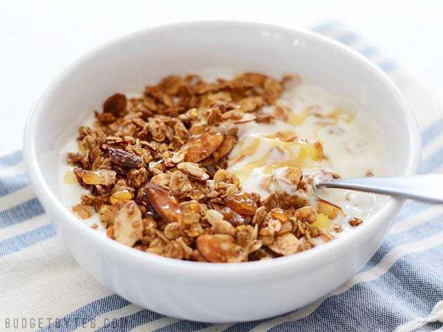 - In a large bowl, stir together the oats, oat bran, and almonds until evenly combined.