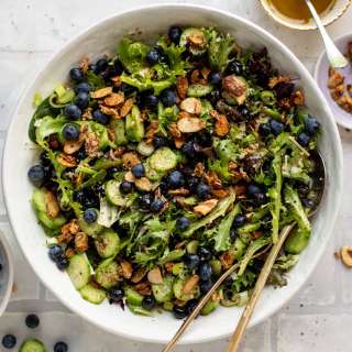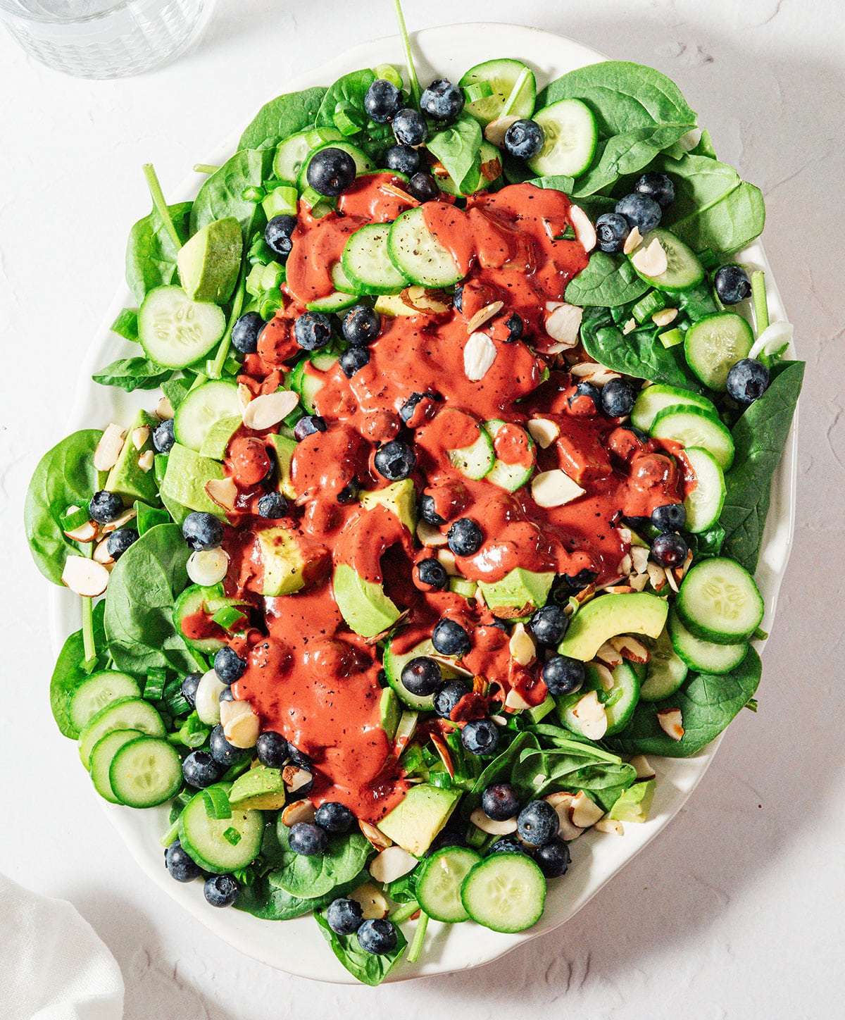 This quick salad is about to become the star of the show! This fresh blueberry salad is topped with my top-rated balsamic blueberry vinaigrette. It's ready in just 10 minutes, and you can pair it with a variety of proteins, such as tofu, chickpeas, and more!