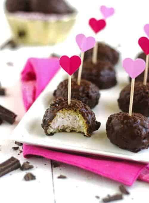 Quinoa is mixed with coconut and made into cute little bites, and then stuffed with gluten free cheesecake! This healthy dessert is then covered with dark chocolate glaze!