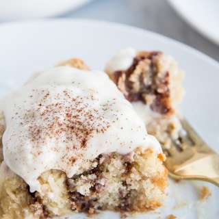 - Bake at 350° for 20-30 minutes, until center doesn't jiggle. While baking, prepare icing. Mix powdered sugar, vanilla and water until smooth and pourable (add more water if needed). Drizzle over hot cake once finished baking.