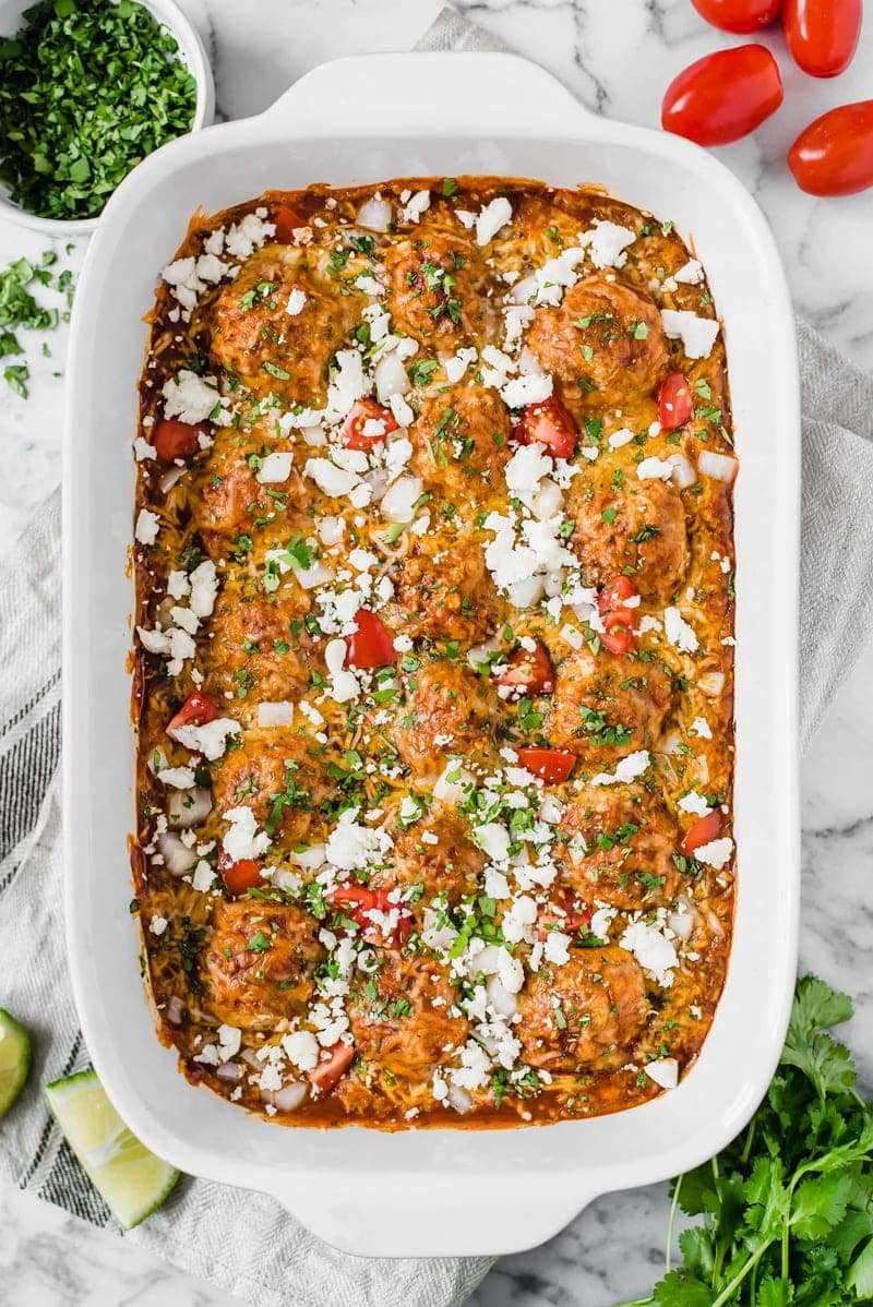 These gluten free chicken meatballs are baked, covered in a red enchilada sauce and topped with cilantro, onions and cotija cheese for a new spin on the classic enchiladas!
