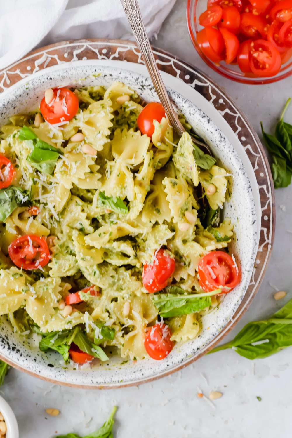 - Then, in an immersion blender cup, add basil, shallot, peeled garlic cloves, pine nuts, seasoning, salt, and olive oil together. Use the immersion blender to blend for 2-3 minutes until a pesto-like texture is created. Be patient as the blender works through the basil, nuts, and onion.