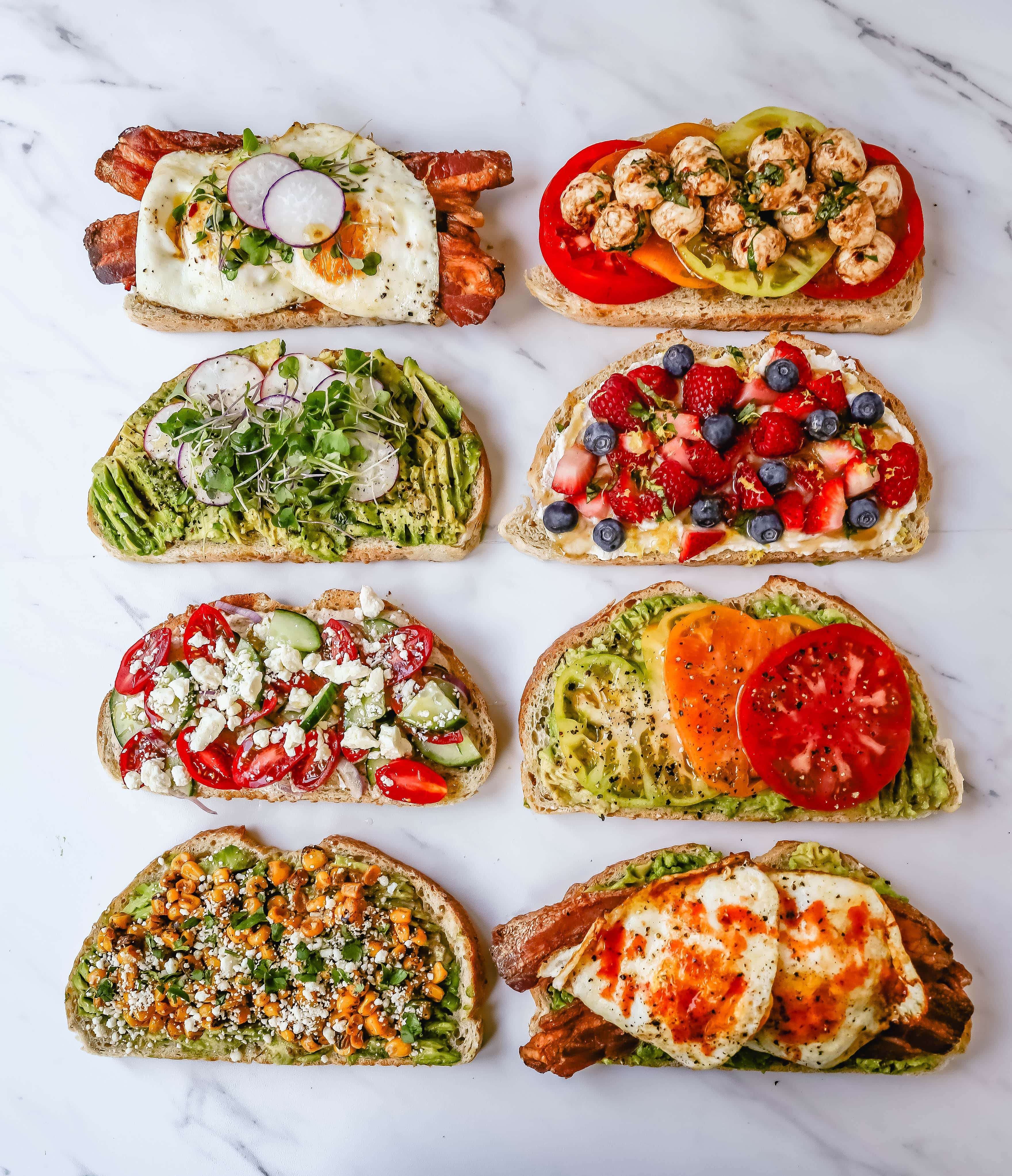 - Bacon + Avocado + Egg + Hot SauceFresh Mozzarella + Pesto + Tomatoes + Balsamic GlazeAvocado + Charred Mexican Corn + Cotija Cheese + Lime Juice + Pickled Fresno ChiliesRicotta Cheese + Honey + Lemon Zest + Fresh BerriesHummus + Cucumber + Tomatoes + Red Onion + Feta Cheese + EVOOAvocado + Heirloom Tomato + PestoBurrata Cheese + Grape Tomatoes + Fresh Basil + Balsamic GlazeAvocado + Microgreens + Thin Sliced Radishes + Red Chili FlakesRicotta + Honey + Dates + AlmondsAvocado + Mini Mozzarella Balls + Halved Grape Tomatoes + Balsamic GlazeBacon + Onion Jam + Fried EggAvocado + Cucumber + Radish + Fresh Pomegranate Seeds Ricotta Cheese + Roasted Tomatoes + EVOO + Balsamic Glaze + BasilFig Jam + Ricotta Cheese + Figs or Dates + HoneyCream Cheese + Cucumbers + MicrogreensAvocado + Fried Egg + Everything Bagel SeasoningBacon Jam + Avocado + Scrambled Eggs + ChivesBoursin Cheese + Cucumbers + Sprouts or MicrogreensProscuitto + Fig Jam + Whipped Goat Cheese