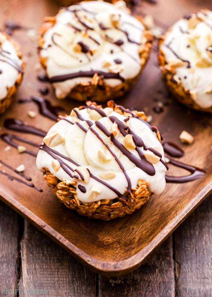 Granola Cups with Peanut Butter Yogurt, Bananas and Chocolate