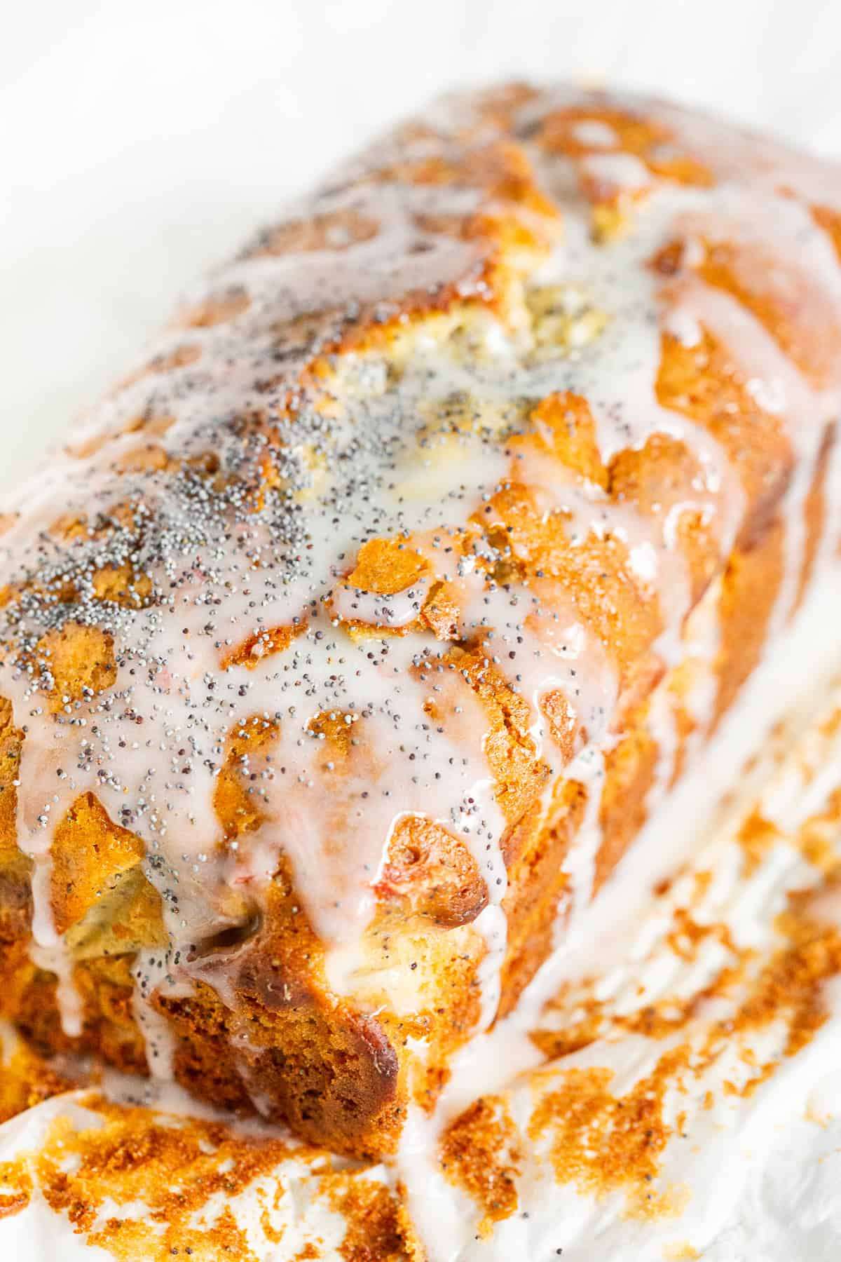 - Once the cake has cooled drizzle the top with Greek yogurt glaze and a sprinkling of poppy seeds if desired.