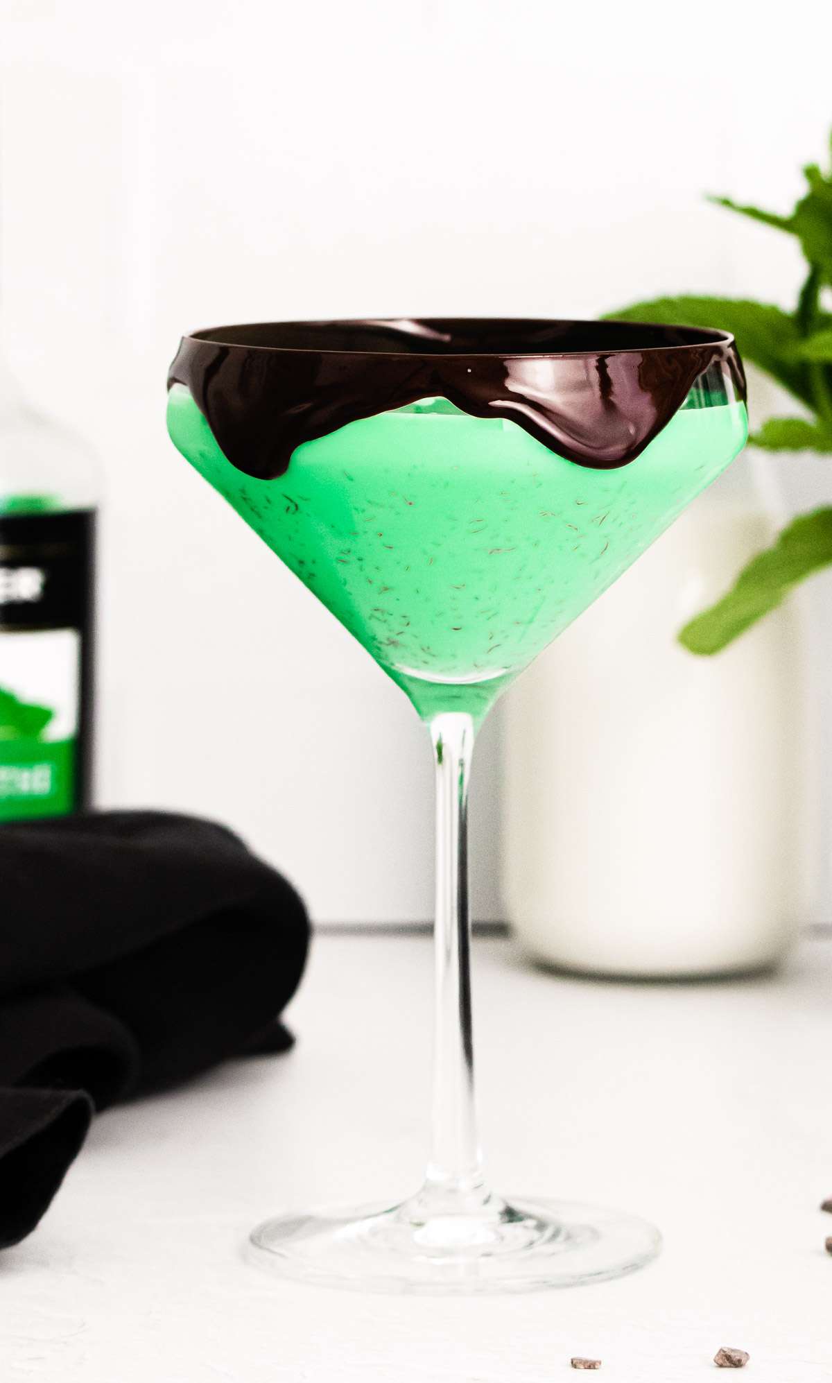 - Fill a cocktail shaker with ice. Add milk, crème de menthe, crème de cacao, and vodka.