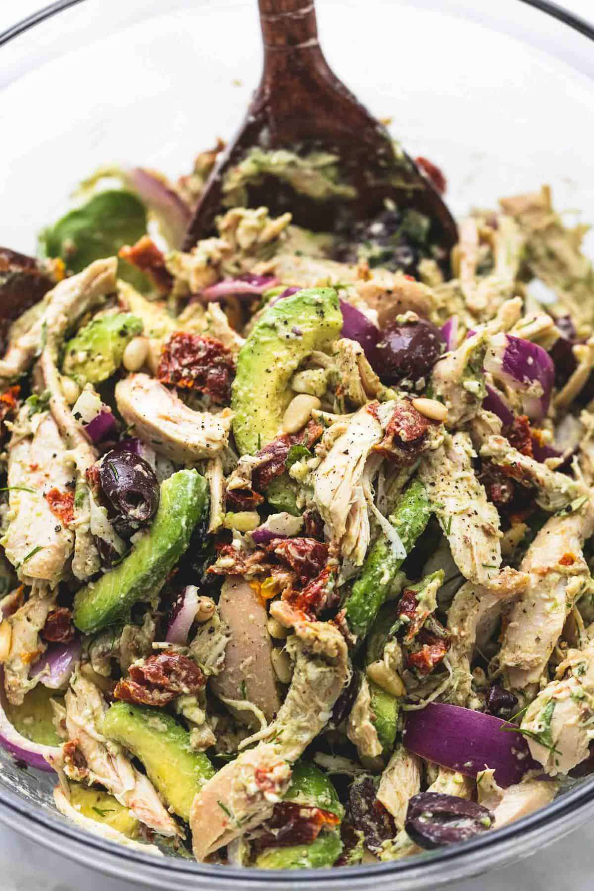 This easy-and-healthy Greek avocado chicken salad is chock-full of hearty and flavorful ingredients like sun dried tomatoes, olives, onions, avocado, feta cheese, and a creamy herb dressing that is to die for.