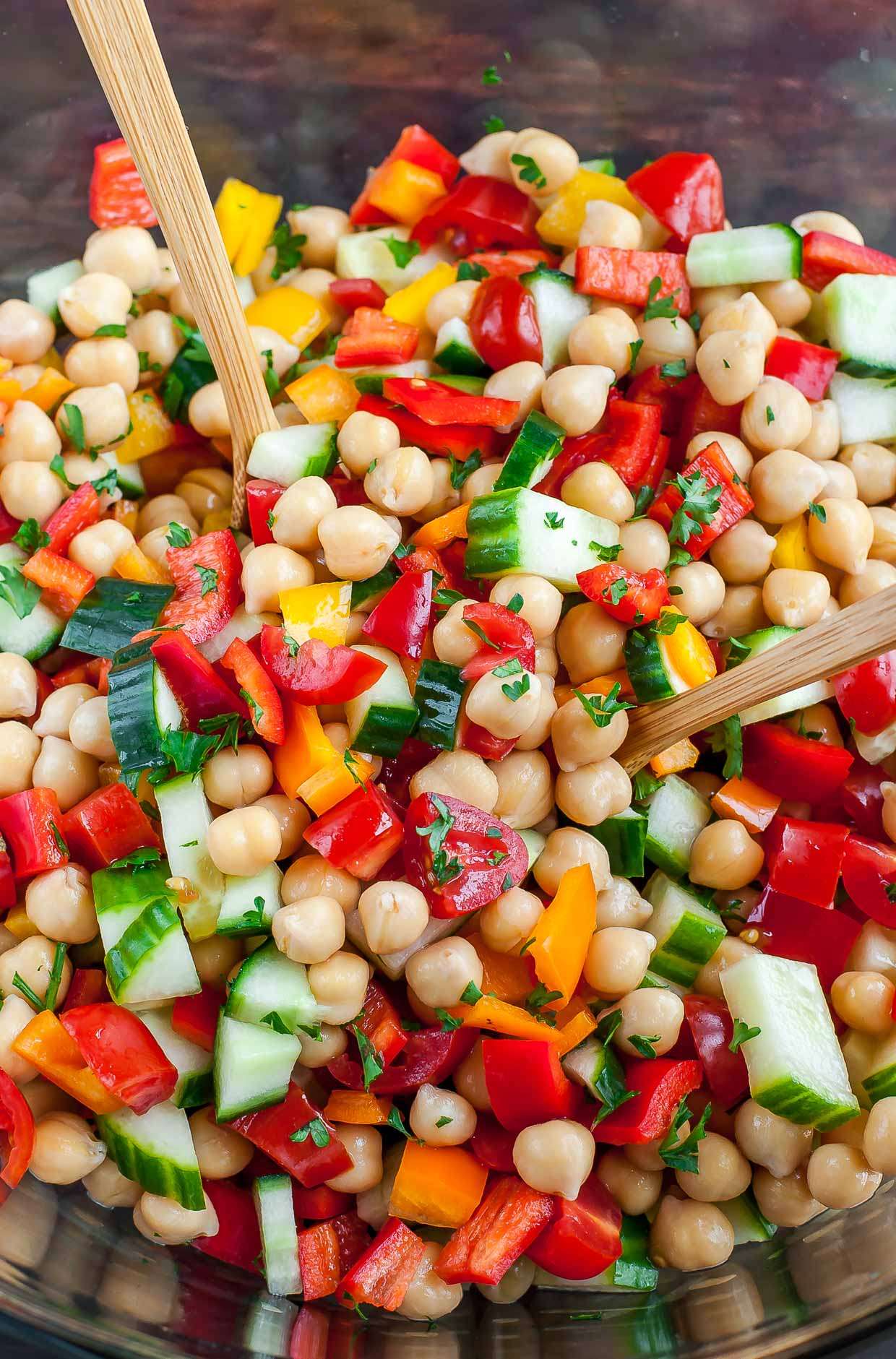 Loaded with fresh veggies and tossed in a light homemade dressing, this tasty vegetarian Greek Chickpea Salad makes healthy eating a breeze!