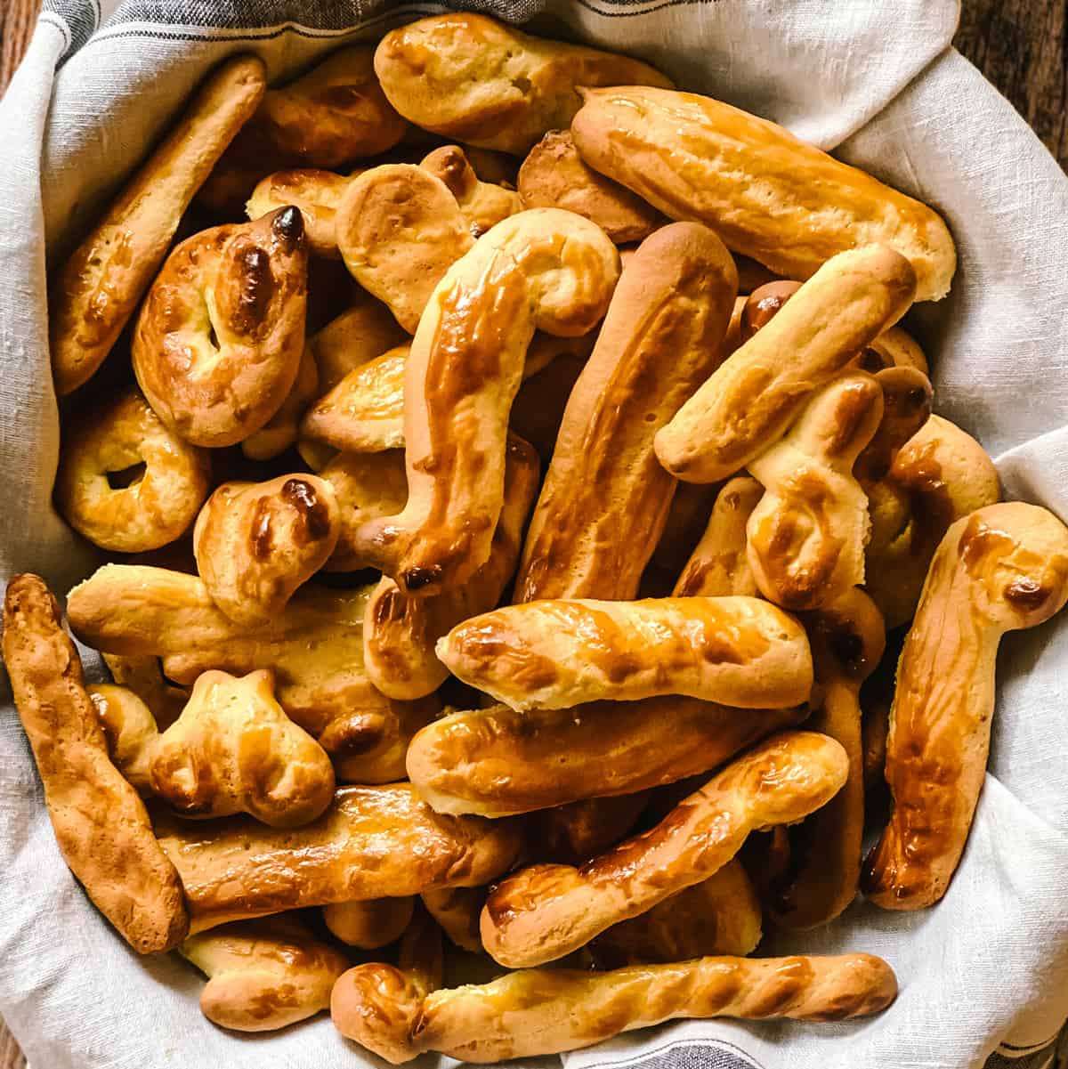 - Start forming the cookies. Pinch off a small dough ball about 1 inch / 3 cm in diameter and roll it into a thin cylinder.Shape the cookies in any shape you like. Braids, circles, or even flowers.Place cookies on a parchment paper lined baking sheet and brush them with the eggwash.