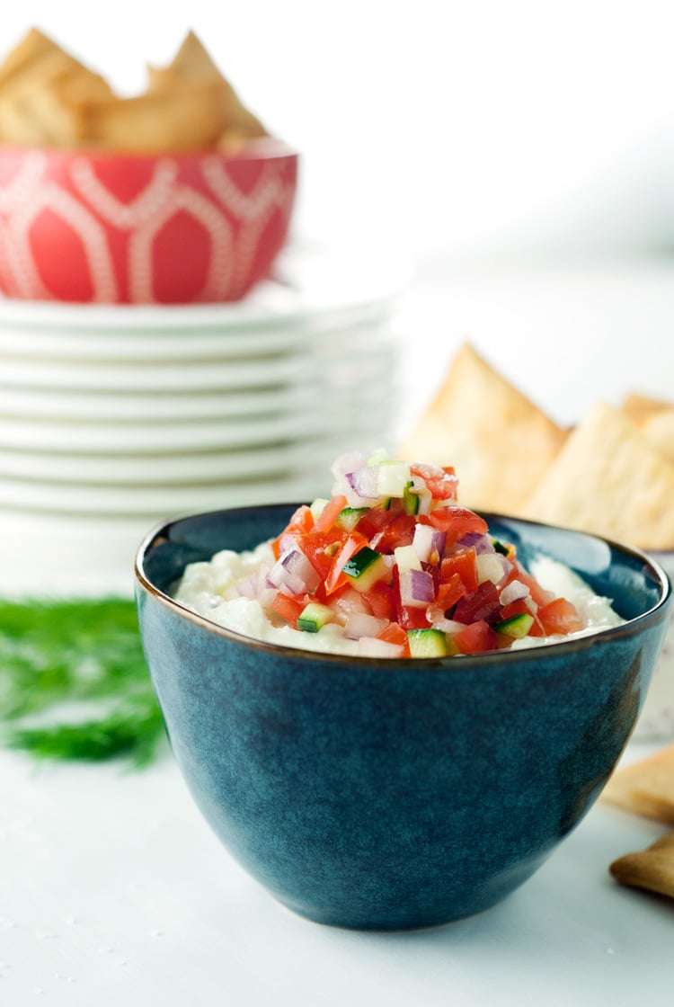 - Add the tomato, cucumber, and red onion to a medium bowl and toss with the olive oil and salt and pepper to taste. Dump the vegetables on top of the dip and serve with pita chips. Enjoy!