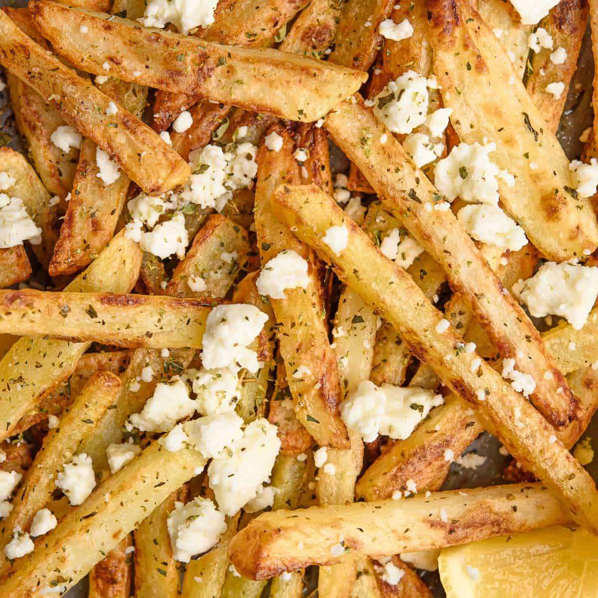 Crispy Greek oregano fries topped with feta cheese and served with lemon. Delicious and healthier, as they are baked in the oven!