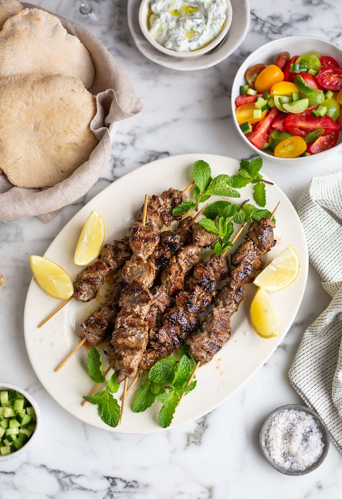 Succulent and tender Greek lamb souvlaki kebabs with easy homemade pita bread recipe.
