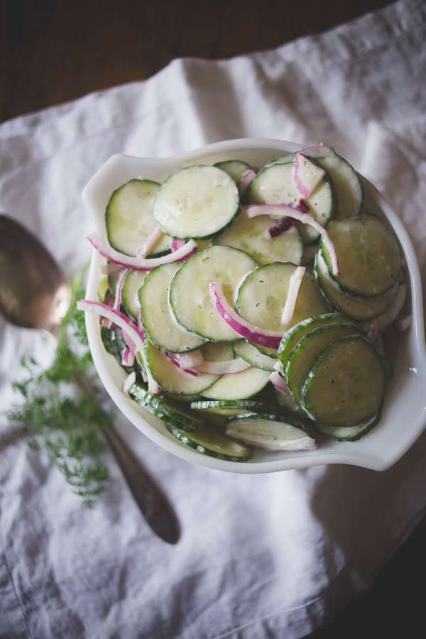 This tangy Greek yogurt ranch cucumber salad is the perfect summertime side dish. Sliced cucumbers mixed with red onions and swimming in a homemade ranch Greek yogurt dressing. Super simple and totally delicious!
