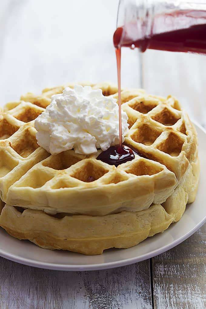 - Grease the waffle maker and cook waffles according to manufacturer's instructions. Serve with butter, syrup, fresh berries, whipped cream, or powdered sugar as desired.