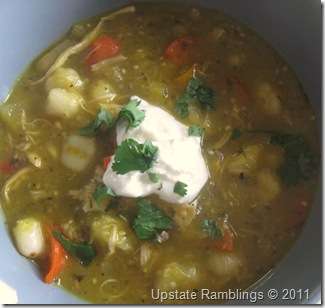 - Mix together the blended tomatillo mixture, sauted vegetables and all the remaining ingredients in a slow cooker and cook on low for 4 or 5 hours.