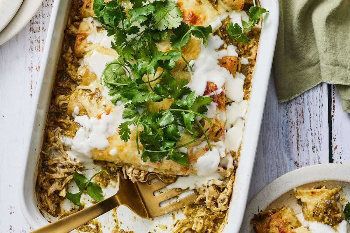 - Dip both sides of each tortilla in green sauce just to coat, then transfer to a baking sheet. Spread 1 cup green sauce lengthwise down the center of a 13×9″ baking dish. Working one at a time, spoon ¼ cup of the chicken mixture into the center of the tortilla and fold one side over the filling, then continue to roll the enchilada up like a burrito.